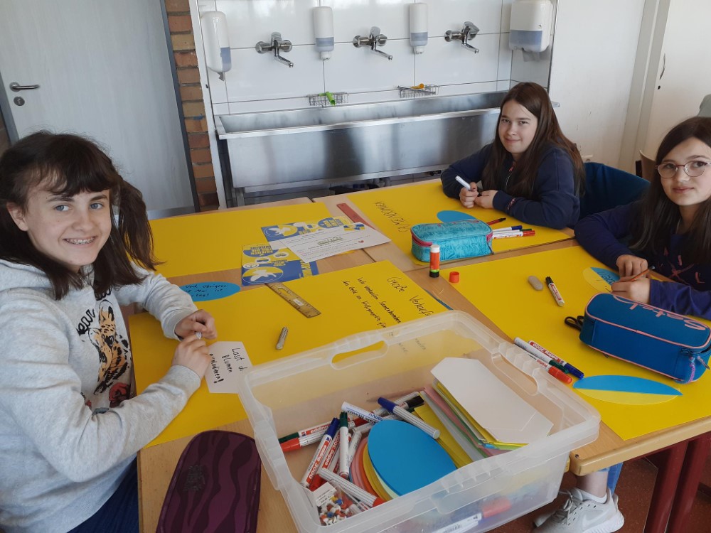 Anna-Lena, Theresa und Laura beim Erstellen der Werbeplakate