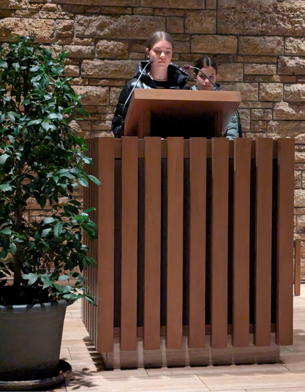 Clara Kimmig und Luisa Steinbrecher erzählten von der Situation in den Klassen, in denen Kinder aus der Ukraine seien, “die den Krieg hautnah miterleben mussten.” Auch im Schulalltag fange es schon im Kleinen an, “Gewalt und Mobbing sind auch nicht mehr fern von uns.” Kimmig und Steinbrecher fragten sich: “Wenn sich die Kleinen schon nicht vertragen, wie sollen es dann die ganz Großen?”