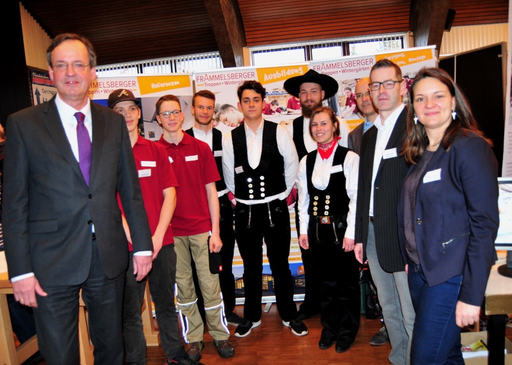 Gespräche und Begegnungen im Rahmen der Berufsinfomesse Oberkirch: OB Braun (links) und (v. rechts): Organisatoren Nadine Klasen und Stefan Cleiß, Rektor Werner Franz im Gespräch mit Vertretern und Azubis von Holzbau Frammelsberger.