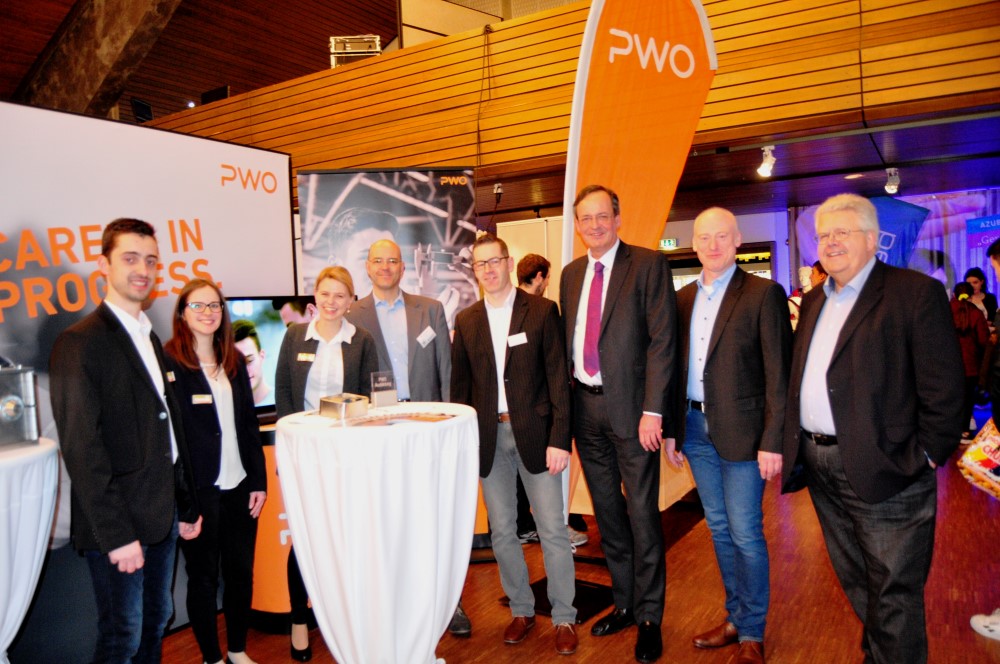 Gespräche und Begegnungen im Rahmen der Berufsinfomesse Oberkirch: (v. rechts) OB Matthias Braun, die Stadträte Michael Braun und Frank Meier, Ko-Organisator Stefan Cleiß und Rektor Werner Franz im Gespräch mit Vertretern der Firma PWO, die dieses Jahr 100 Jahre alt wird.